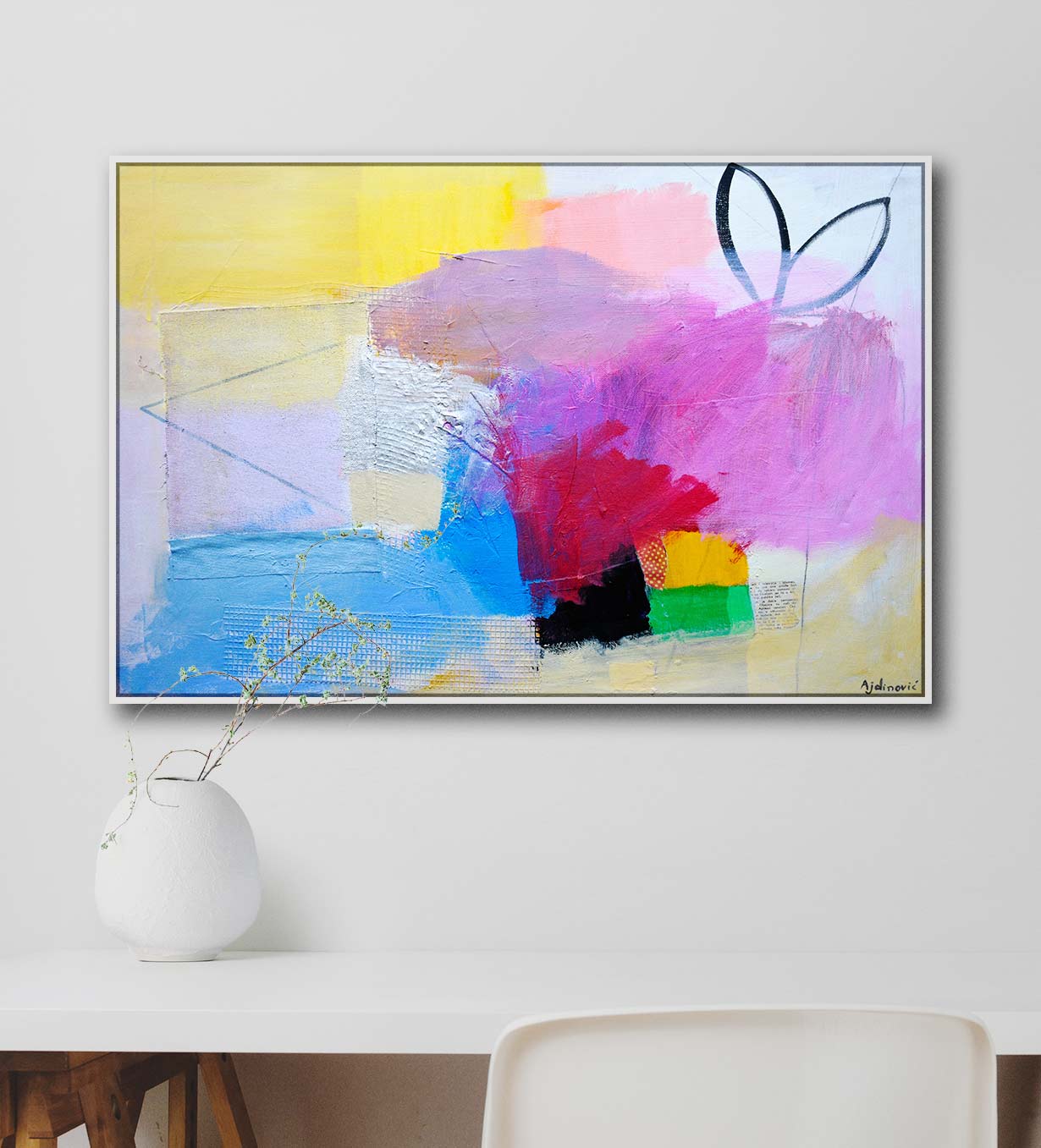 Suton umjetnička slika apstrakcija na platnu original slikara Ranka Ajdinovića u moderno interijeru iznad stola.