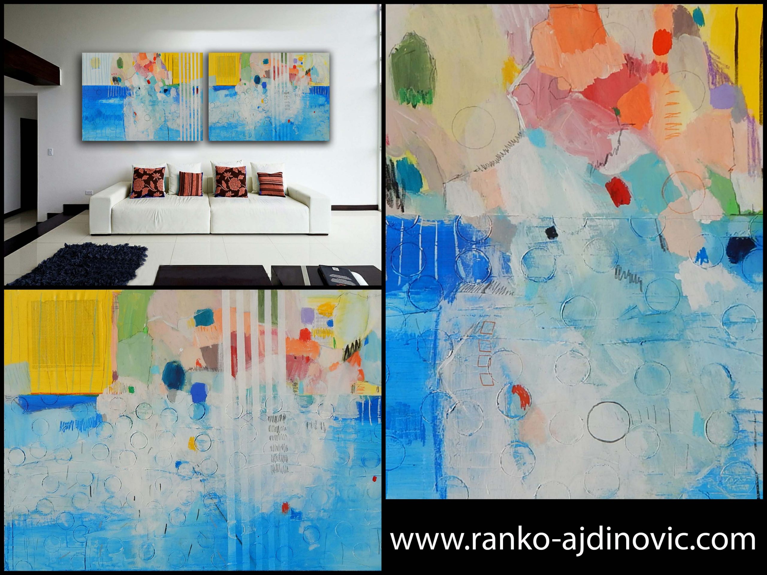 Ukupna dimenzija ovog modernog diptiha je 240 x 80 cm. Tehnika je akril na vrhunskom galerijskom platnu koje je napeto na drveni okvir. Samim time uokviravanje nije potrebno, te sliku možete odmah postaviti na zid. Slike šaljem širom Hrvatske i svijeta.