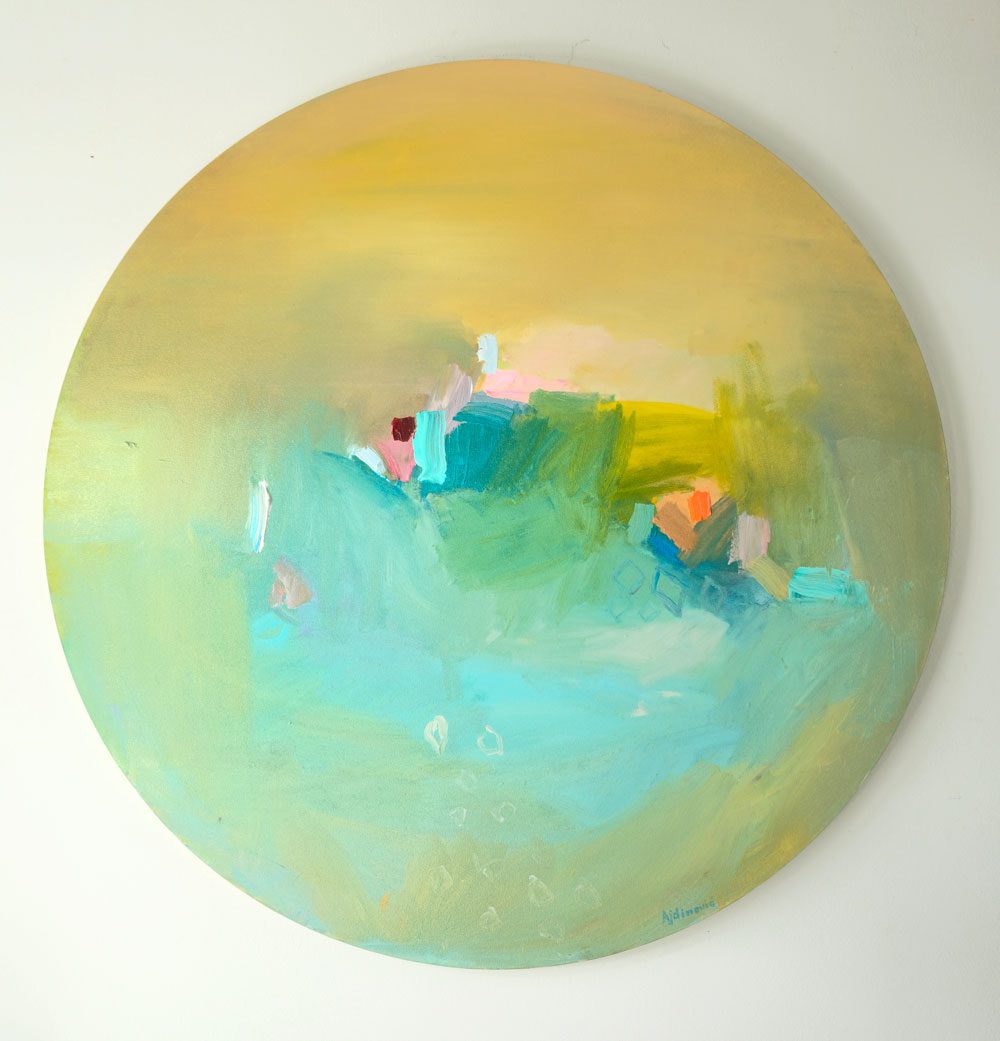 The painting has a unique round format and is executed in a modern abstract style. It was created in 2023, and the technique is