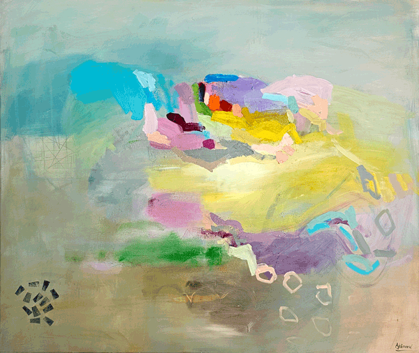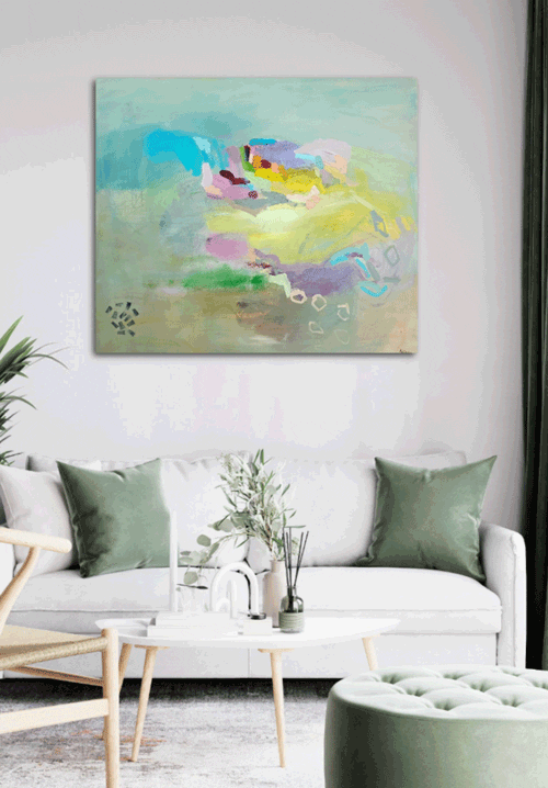 The image is horizontally rectangular. It was performed in the style of modern lyrical abstraction. It was created in 2023, and the technique is acrylic on canvas. This painting was exhibited at the ArtZagreb 2023 exhibition. It is an excellent original signed work of art that bears the real thing artistic energy and lasting value to your space. As such, it will enhance every interior and the people who live in it.