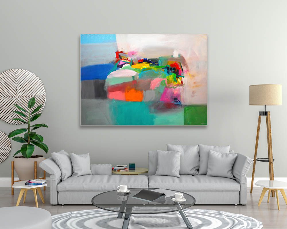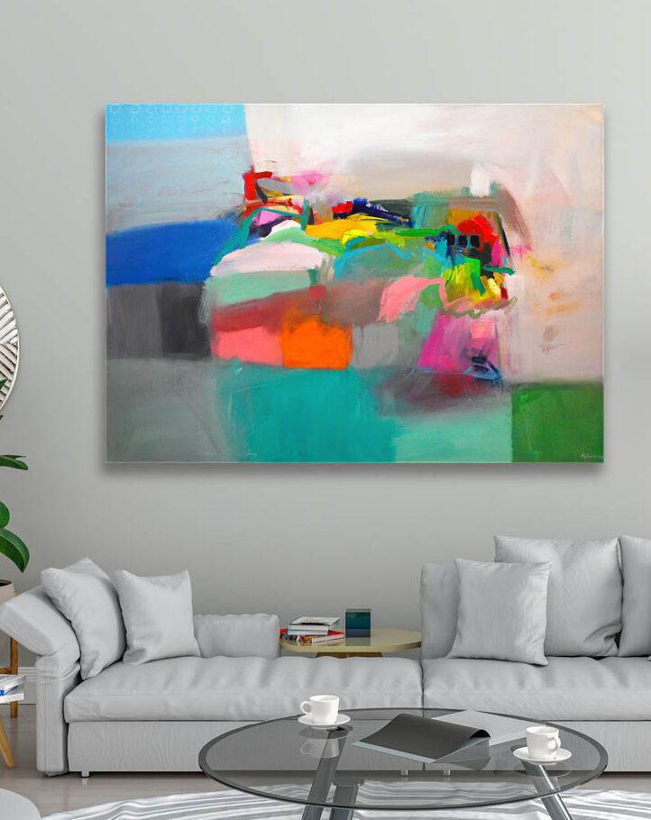 Ajdinovic Ranko moderna velika umjetnička slika na platnu za dnevni boravak. Originalno likovno djelo horizontalnog formata u dimenzijama 120 x 150 cm umjetničko je djelo akademskog slikara. Ovo je jedinstveni i jedini primjerak u svijetu kao takav izveden u stilu moderne geometrijske apstrakcije. Rad je nastao u 2022. godini, a tehnika je akril kombinirano na platnu koje je napeto na profesionalnim drvenim letvicama. Svi rubovi platna su oslikani u tonu slike tako da djelo daje dojam 3D efekta. Samim time slika je pripremljena i spremna za postavljanje